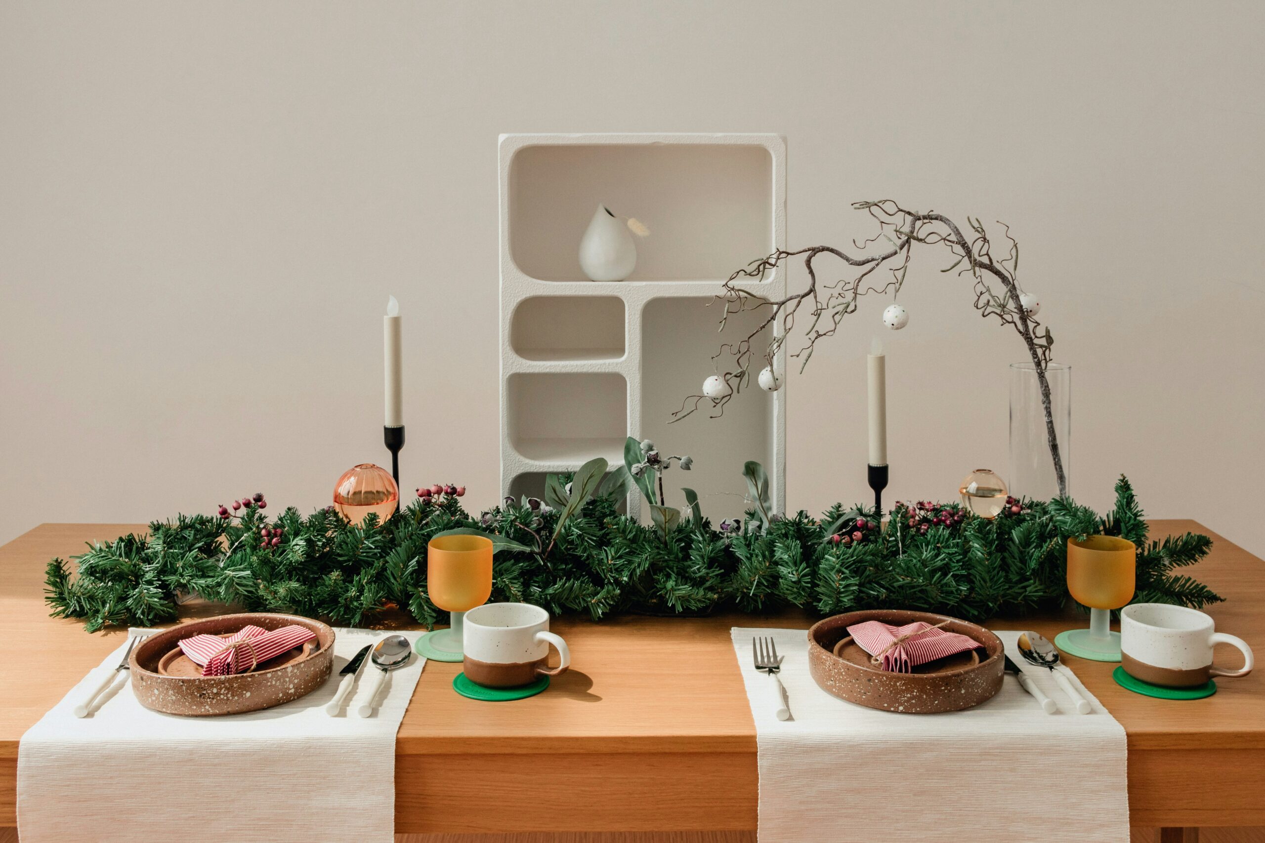 - Grünzeug: Tannenzweige, Eukalyptus oder Olivenzweige einfach locker zusammengesteckt oder lose auf dem Tischläufer verteilt. So wirkt der Look schön luftig.