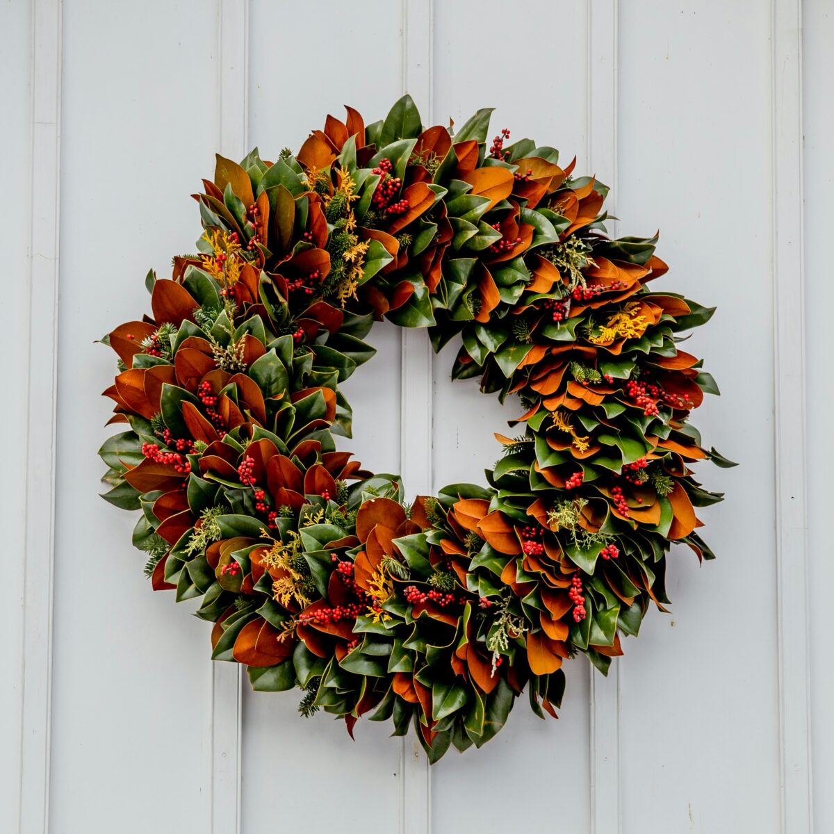 Rund binden (oder binden lassen) und reduziert dekorieren: ein Mix aus Tanne, Eibe, vielleicht Beerenzweige. Dazu ein paar Wacholderbeeren, getrocknete Orangenscheiben, Zimtstangen – fertig.