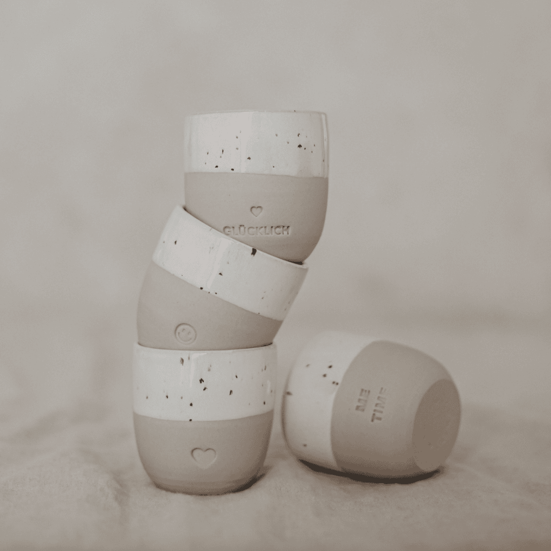 Die hübschen Espresso-Becher aus Steingut von EULENSCHNITT werden von einer kleinen Töpferei in Portugal handgefertigt und bestechen vor allem durch die kontrastierende Oberfläche aus glasiertem und rauem Ton. Mit liebevollen Botschaften und netten Sprüchen sorgen sie für ein Augenzwinkern auf dem Tisch. Styling-Tipp: Die natürliche Musterung erinnert an die Schale von Wachteleiern und kommt besonders gut in Kombination mit Holz und Leinen zur Geltung.