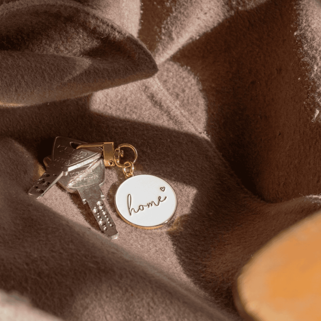 Der hübsche Schlüsselanhänger „Home“ ist ein absolutes Must-Have für jeden, der sein Zuhause immer bei sich tragen möchte. Die Rückseite in Gold verleiht dem Anhänger einen Hauch von Eleganz.