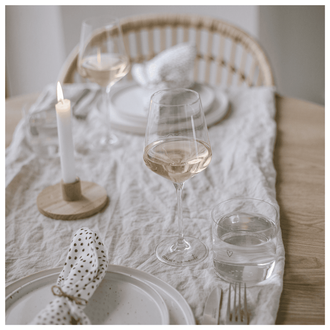 Die neuen Eulenschnitt Weingläser sind dünnwandig, dadurch leicht und dennoch extrem stabil. Genau das macht sie in Verbindung mit dem minimalistischen Design so besonders. Zudem sind sie ein absoluter Allrounder – egal ob für Weißwein, Rotwein oder Rosé. Das Glas ziert eine wunderschöne Aufschrift am Glasboden, so springt es dezent ins Auge, wenn das Weinglas am Tisch dekoriert ist und zaubert jedem Gast ein Lächeln ins Gesicht. Fräulein Anna Styling-Tipp: Die Gläser lassen sich nach belieben kombinieren und unterschiedliche Designs mit einander mischen – so werden auf der nächsten Party keine Gläser mehr vertauscht!