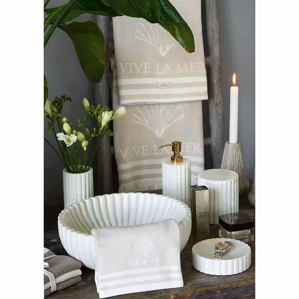 Dürfen wir vorstellen: Dein neuer Sommerbegleiter! Das übergroße Vive la mer-Badetuch von Greengate ist besonders weich und verbindet maritimes Design mit Komfort.