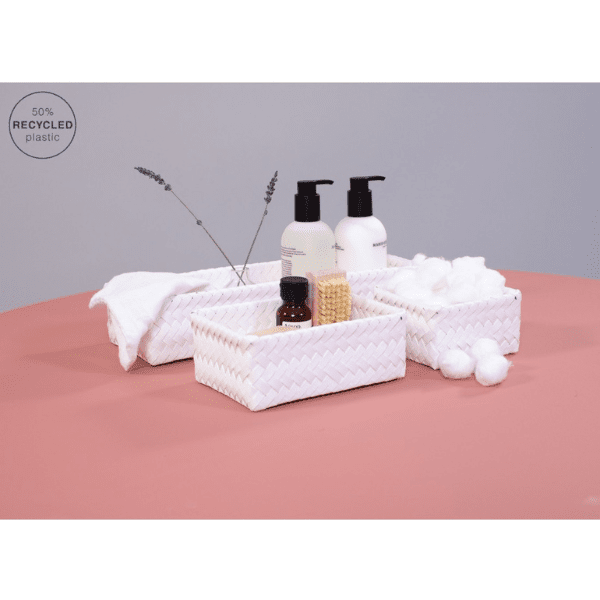 Der Aufbewahrungskorb FIT long macht seinem Namen alle Ehre. Er hat ein langes und schmales Format, damit auch die umständlichsten Ecken im Haus perfekt genutzt werden können. Praktisch auf dem Schreibtisch, im Badezimmer oder als Organizer in der Schublade. Das Besondere: Sie sind handgeflochten und bestehen zu 50% aus recyceltem Kunststoff.
