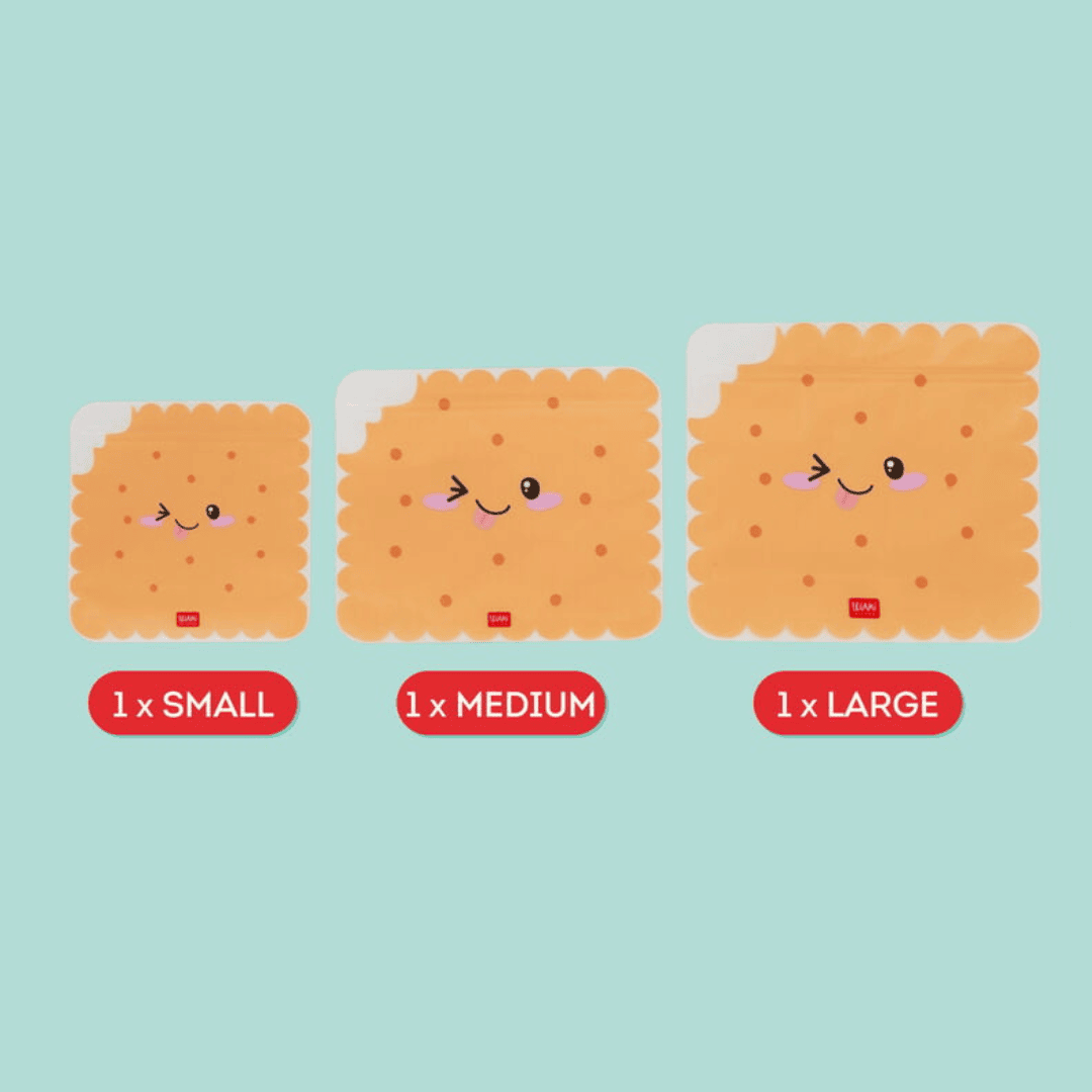 Ob Kekse, Salzgebäck, Obst oder Cracker – in den praktischen wiederverschließbaren, wiederverwendbaren und spülmaschinenfesten Beuteln können alle Snacks aufbewahrt und bleiben dabei frisch und duftend. Plus: In drei unterschiedlichen Größen ist für jede Leckerei die passende Verpackung dabei!