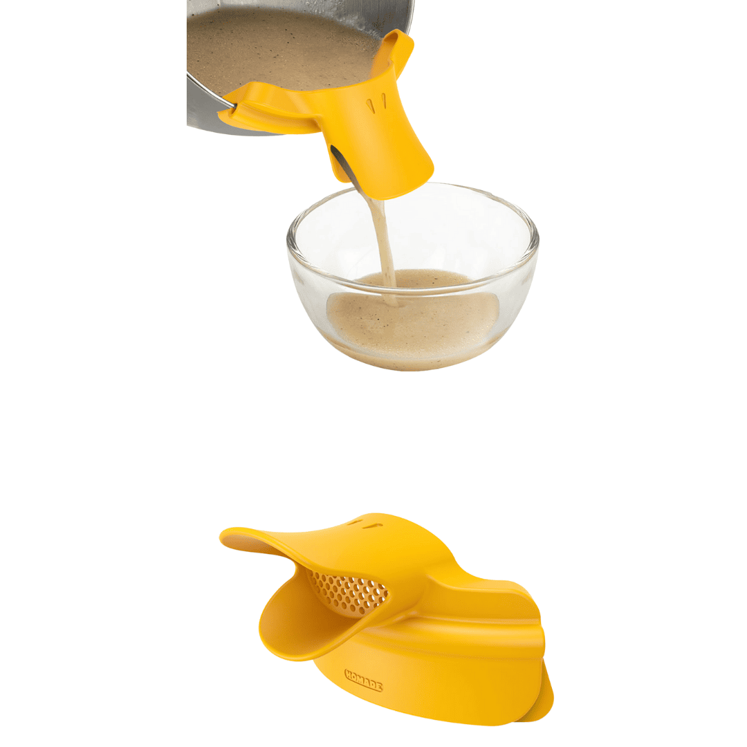 Praktisch und lustig: Der Topfausgießer in Entenschnabel-Form sorgt dafür, dass kein Tropfen der leckeren Soße beim Abgießen verloren geht. Einfach an den Topfrand befestigen und fertig – ein Sieb, um dickere Stückchen zurückzuhalten ist im Schnabel integriert!