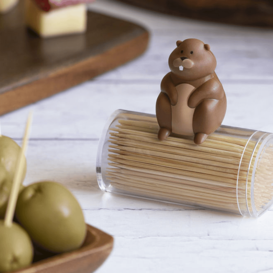 Sitzt gerne auf seinen Holz-Vorräten: Der süße Biber „Woody“ ist ein gerngesehener Gast beim Aperitif, denn er hat für jede Olive oder gefüllte Mini-Paprika den passenden Zahnstocher parat!