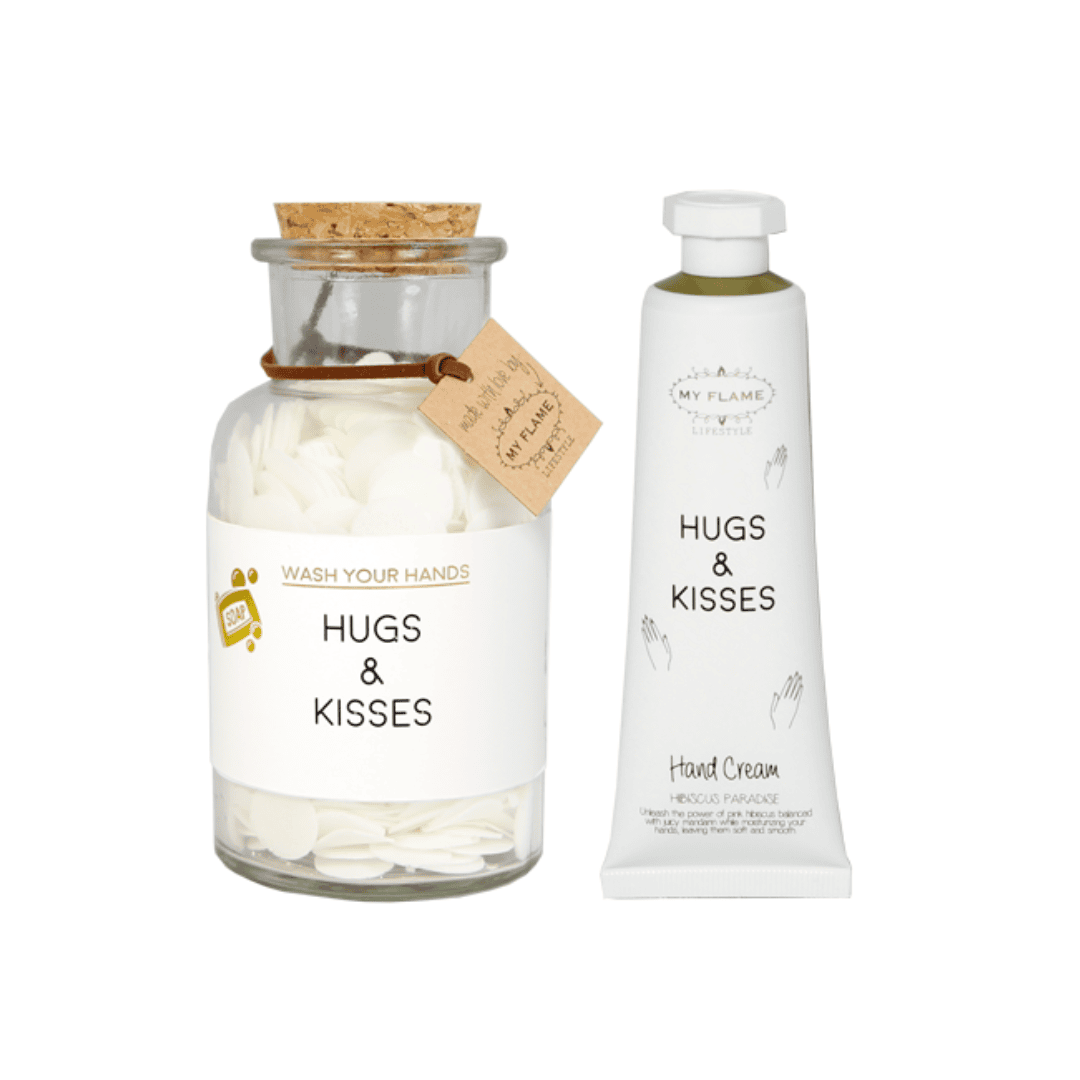 Das perfekte Geschenk für Beauty-Queens: Diese hübsche Giftbox von MY FLAME beinhaltet eine süße Handcreme in der praktischen Größe von 50 ml mit der Aufschrift „Hugs & Kisses“. Dazu gibt es die passenden Handseifen-Konfettis im Glas. Die Konfettis schmelzen beim Kontakt mit Wasser und verwandeln sich in sanfte Seife mit dem Duft „Fresh Cotton“.