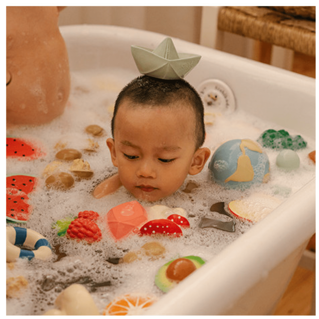 Ahoi! Wie ein handgefaltetes Papierschiff in Origami-Optik ist dieses Badespielzeug-Schiff bereit in See zu stechen. Aus 100% Naturkautschuk vom Hevea-Baum und in einem Stück gefertigt, sodass Bakterien nicht eindringen können, ist er auch optimal als Beißring.