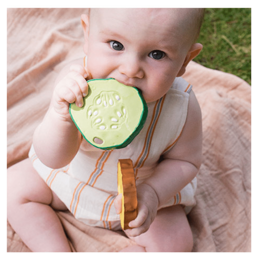 Saftig-lecker wird das Beißen-Lernen mit der Gurkenscheibe von OLI & CAROL! Die witzigen Beißspielzeuge sind eine optimale Unterstützung beim Zahnen, aber auch eine spaßige Ablenkung beim Baden. Die realistische Textur hilft die Sinne von Babys zu stimulieren und das Zahnfleisch zu entlasten. Auch super: Alle Beißspielzeuge werden aus einem Stück ohne Loch hergestellt, um die Bildung von Bakterien im Inneren zu vermeiden!
