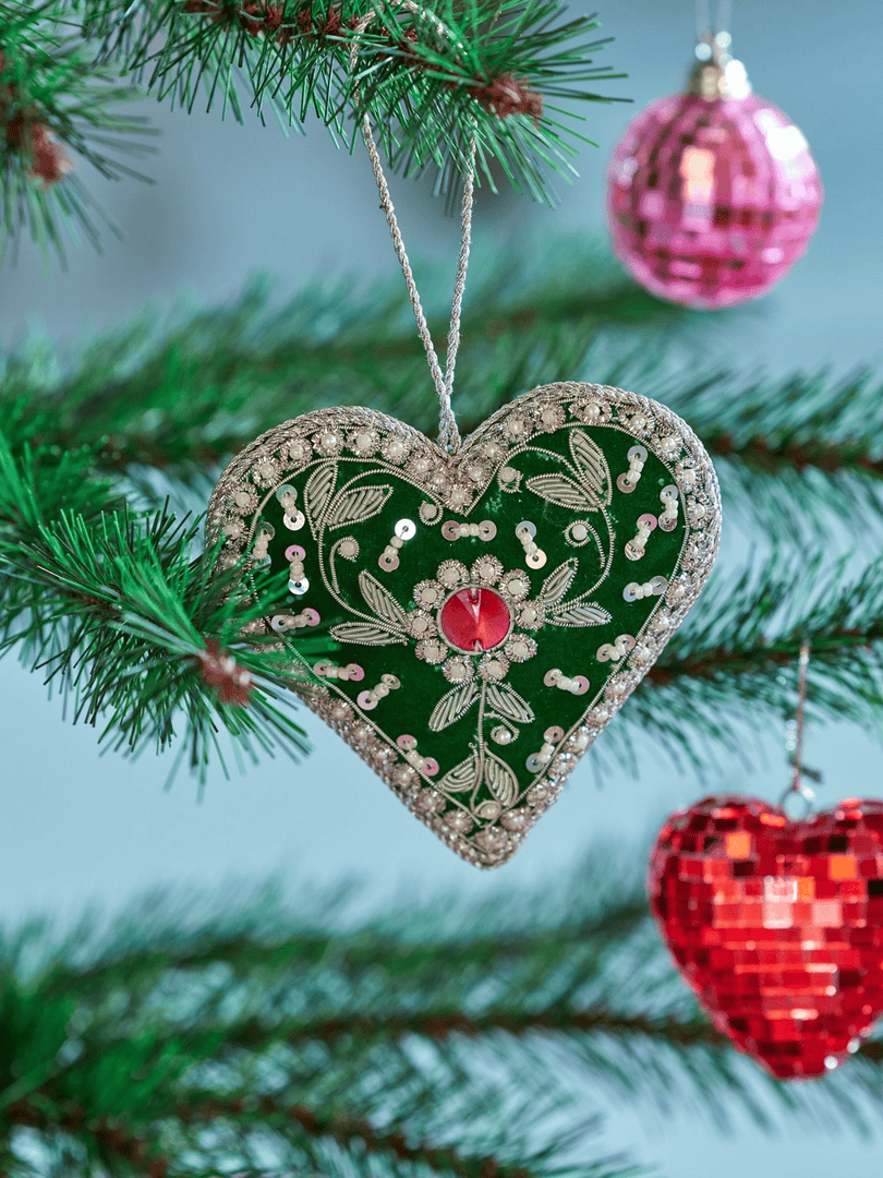 Mit diesem besonderen handgefertigten Ornament verleihst du deinem Zuhause etwas Weihnachtszauber. Es ist mit Perlen besetzt und voller grüner und silberner Details. Die perfekte Deko für den Christbaum, als Fensterschmuck oder herziges Detail deines Table-Settings.