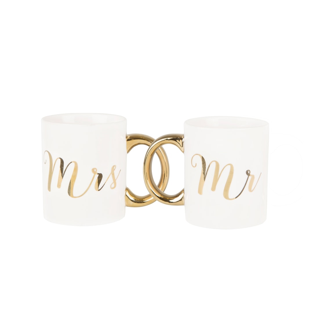 Schön verarbeitete, teilweise vergoldete Tasse mit dem Schriftzug „Mrs“. Lässt sich mit „Mr“ ideal ergänzen, die Henkel ergeben dann symbolisch die verbundenen Ringe.