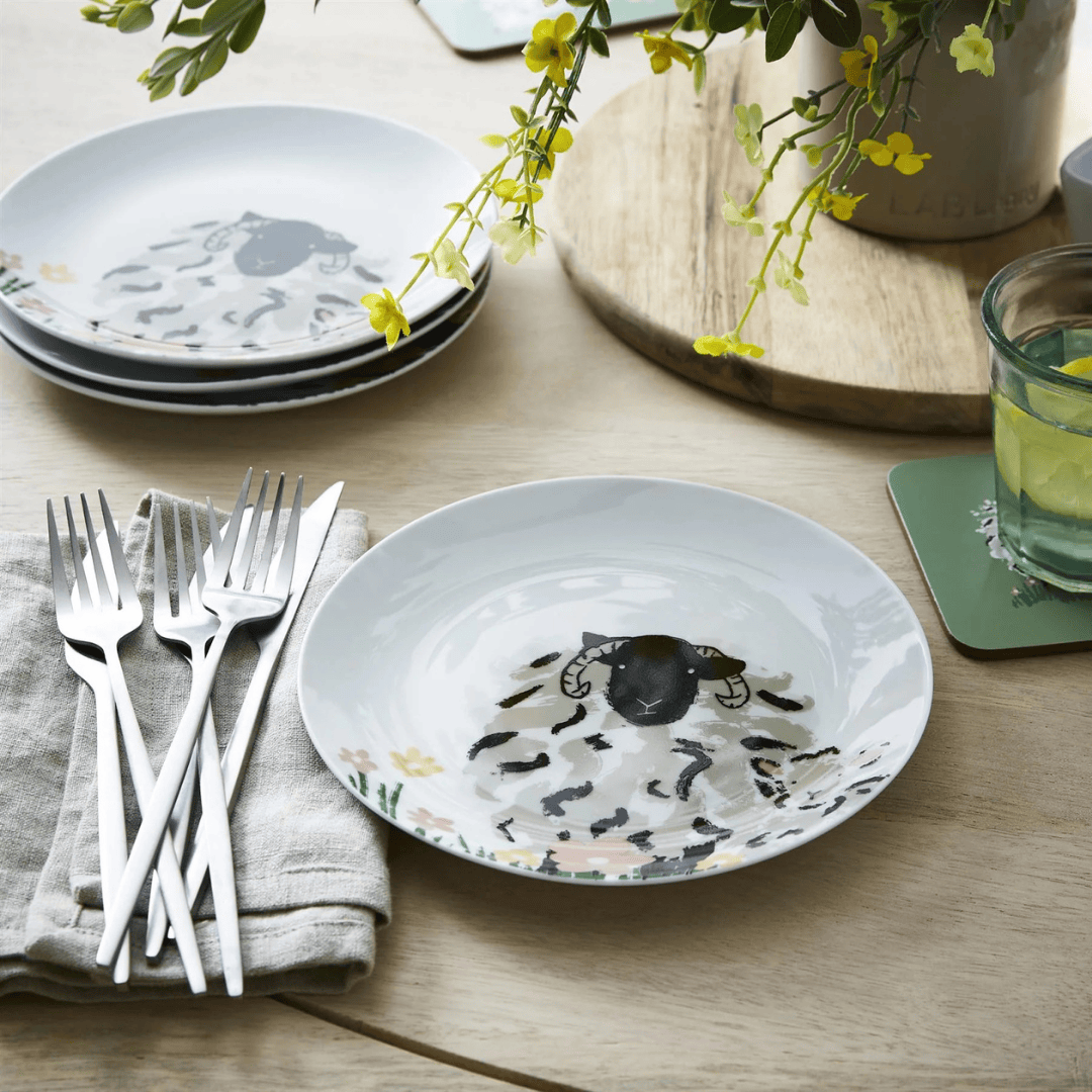 Aus hochwertigem Porzellan mit süßen Schaf-Zeichnungen zaubert das „Woolly Sheep“-Geschirr einen verspielten Look auf den Esstisch.