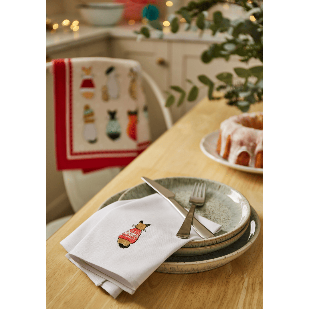 Mit süßem Christmas Cats-Motiv bringen diese hübschen Servietten eine ordentliche Portion X-mas-Vibes auf den Esstisch. Zusammen mit passender Schürze oder Ofenhandschuhen übrigens auch ein schönes Weihnachtsgeschenk für alle KatzenliebhaberInnen!