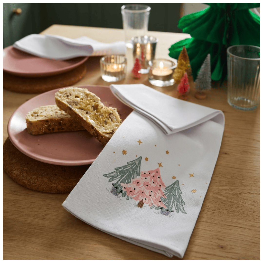 Mit pastelligen Tannenbäumen bringen diese hübschen Servietten eine ordentliche Portion X-mas-Vibes auf den Esstisch. Zusammen mit passender Schürze oder Ofenhandschuhen übrigens auch ein schönes Weihnachtsgeschenk!